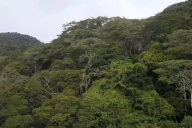 Aerial view of lush forested land in Altos del María Panama with mountain backdrop