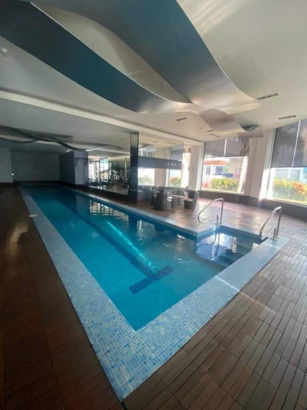 Modern indoor pool with wave ceiling, wooden deck and seating in PH Loft 41, Punta Pacifica Panama City