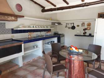 Rustic style kitchen with tile counters open shelves at Playa Coronado rental