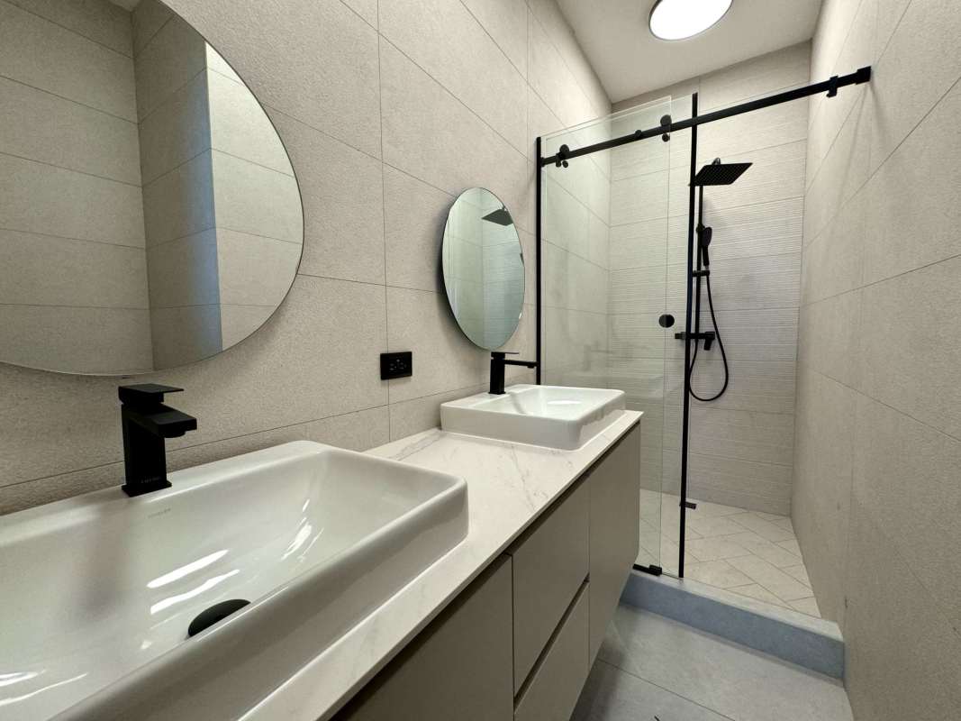 Modern marble bathroom with double sinks, glass-enclosed shower, black fixtures in PH Aquapoint, Punta Paitilla Panama City