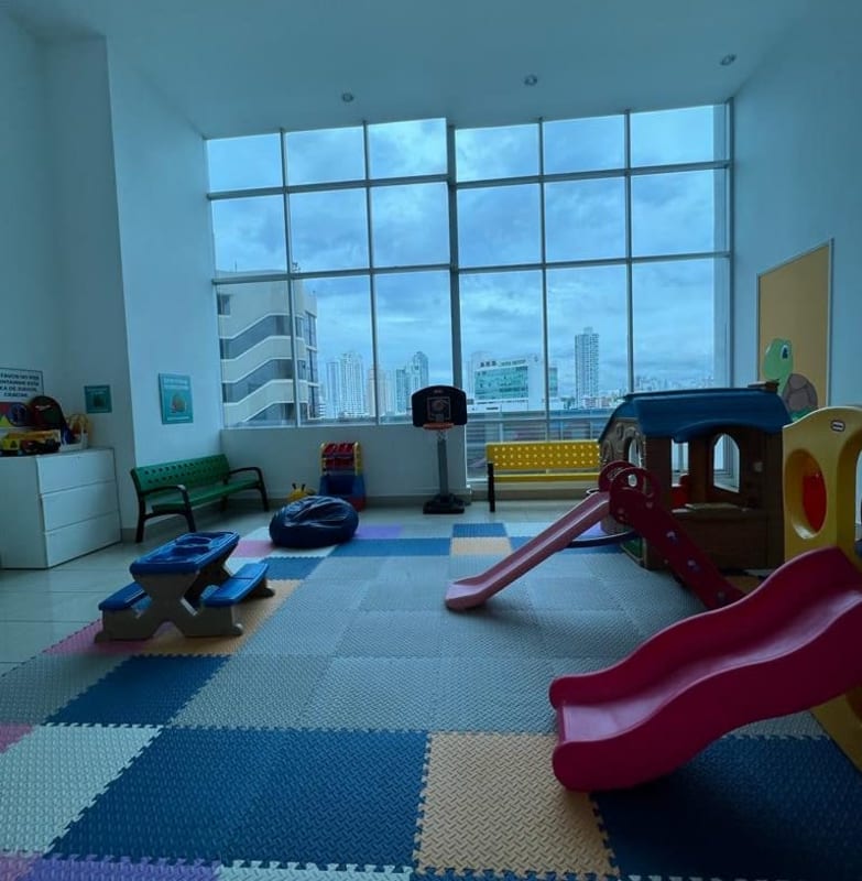 Colorful children's playroom with large windows, padded mats, slide, playhouse at PH Waterfalls Panama City