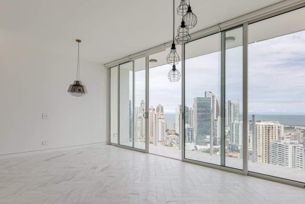 Bright luxury living room high floor at Wanders & Yoo Panama with panoramic city skyline and ocean views