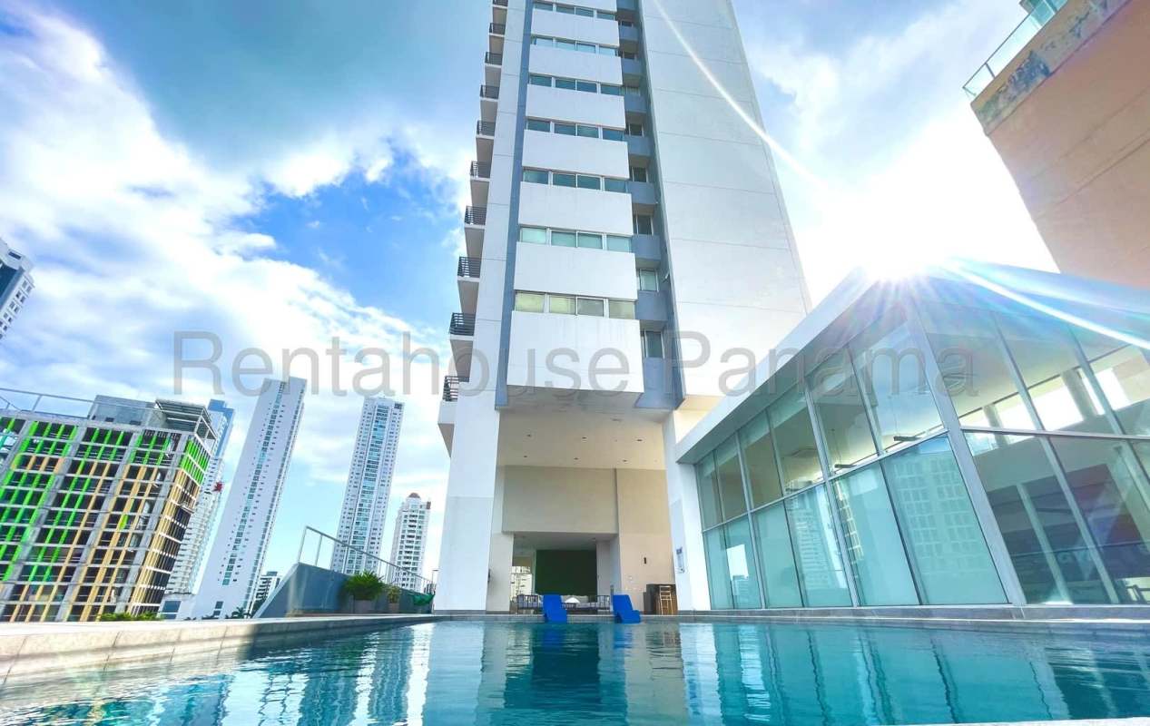 Modern high-rise PH Panorama building with outdoor infinity pool overlooking Pacific Ocean in Coco del Mar Panama City