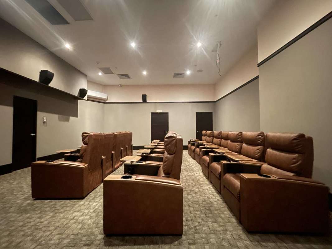 Private theater room with leather recliners.