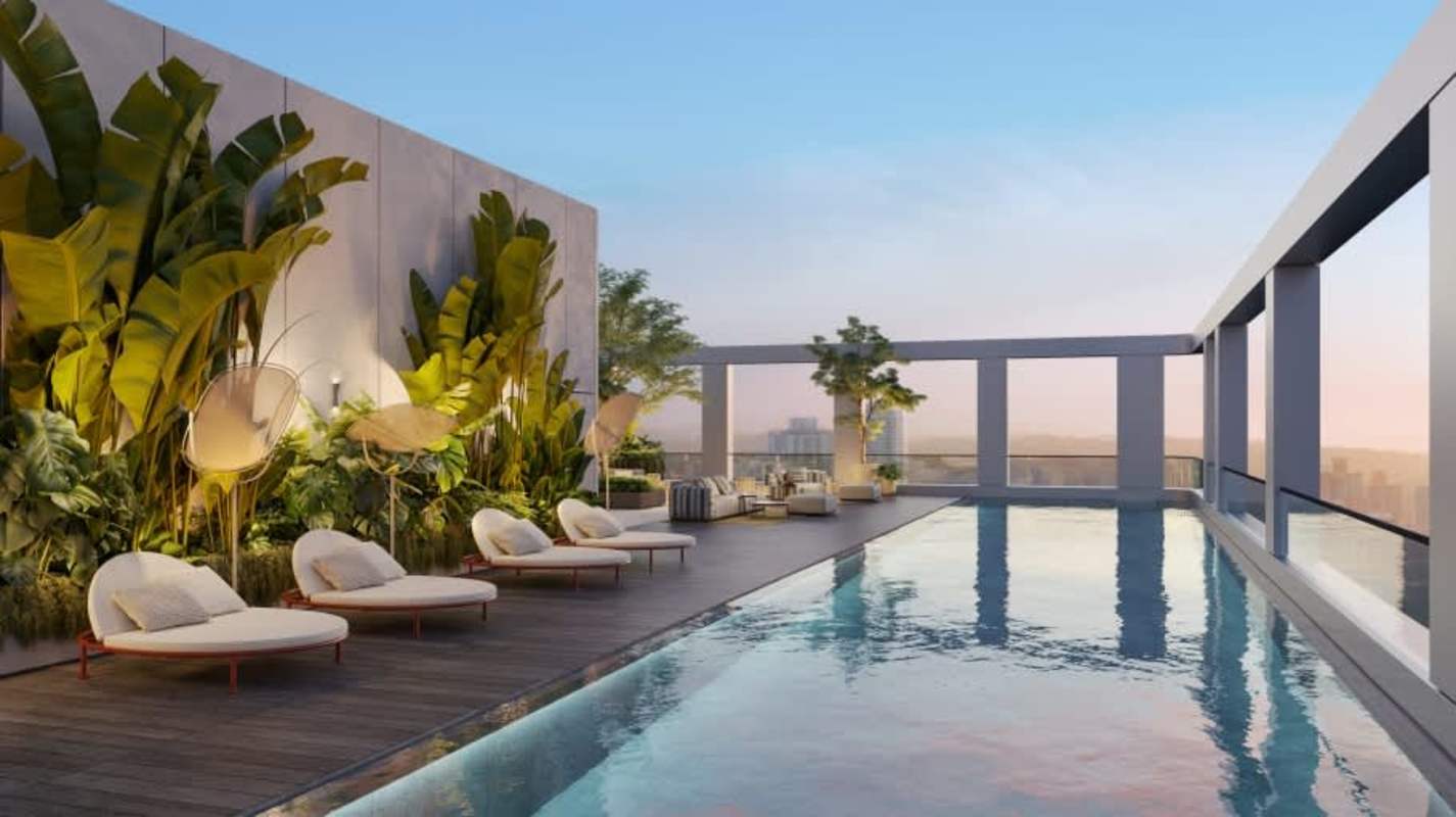 Luxury rooftop infinity pool surrounded by tropical plants and lounge areas at PH Sky Obarrio Panama City