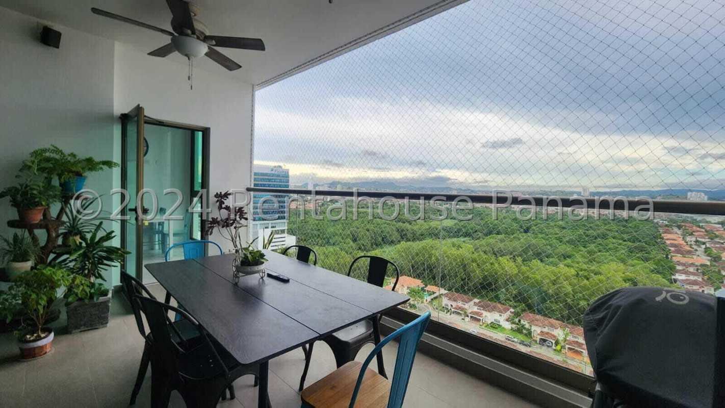 Spacious balcony with ceiling fan, seating area, safety net, and panoramic Costa del Este skyline views at PH Parkview Panama City