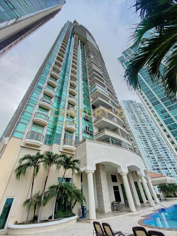 Luxury Pacific Point condominium tower 300 with infinity pool and palm trees, Punta Pacifica Panama