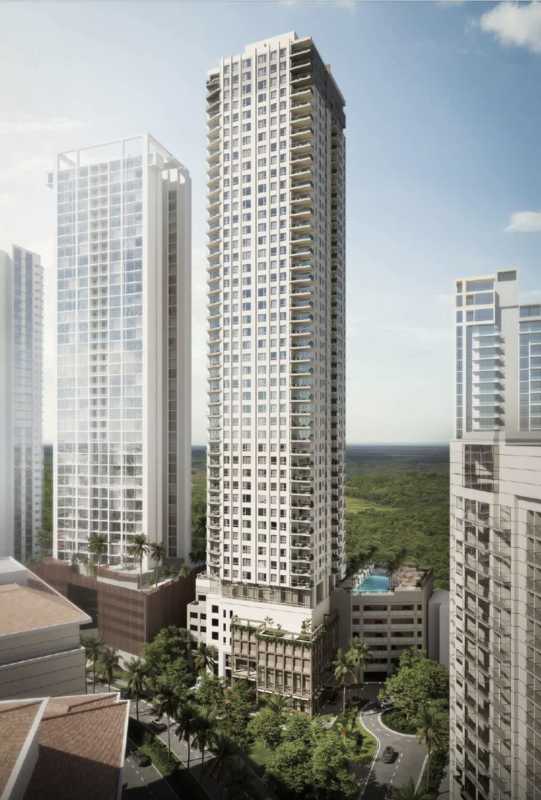 Exterior: High-rise condominium with sleek design, balconies, rooftop pool
