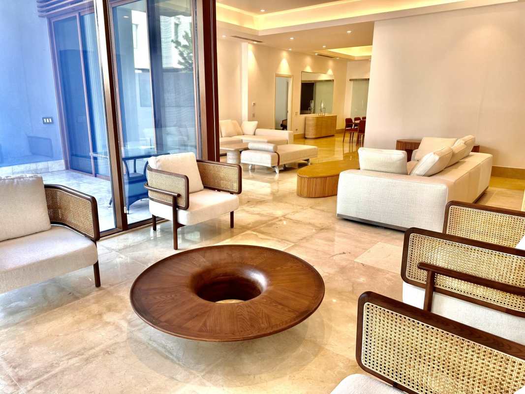 Modern furnished living area with marble floors and terrace in Ocean Reef Gardens on private island Punta Pacifica Panama