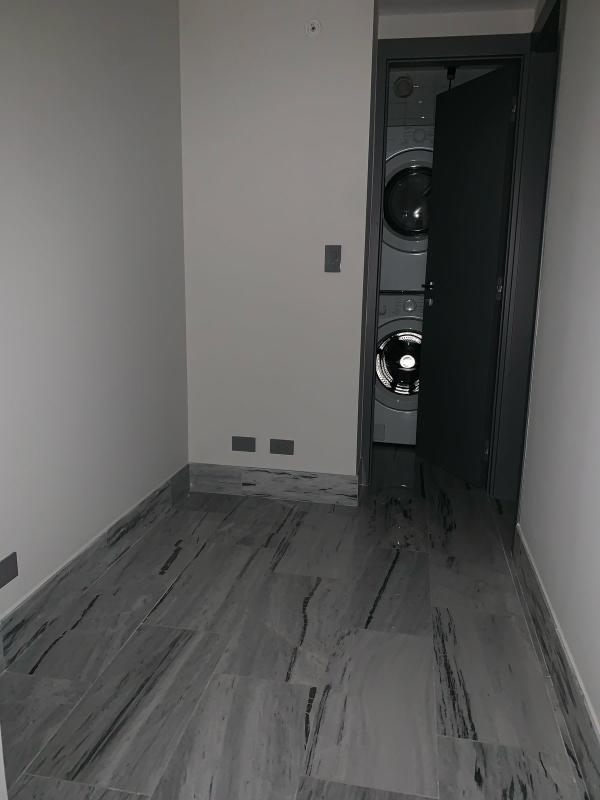 Modern laundry room with stacked washer & dryer, neutral colors in PH Nuovo Armani Casa Avenida Balboa Panama City