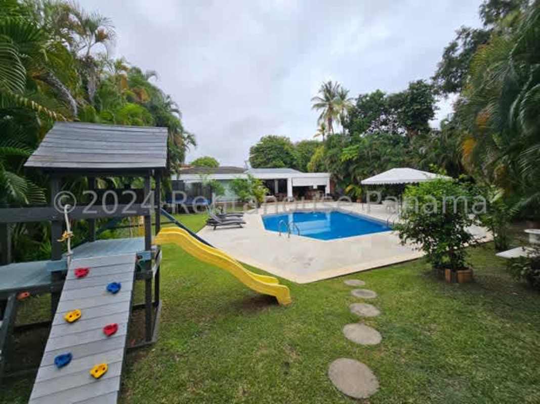 Experience luxurious single-story living in Altos del Golf, Panama City. This stunning 749 m² residence on a 1,493 m² lot features 4 spacious bedrooms and 4.5 baths, offering elegance and privacy throughout. Expansive living and dining rooms with marble floors flow into a gourmet granite kitchen and family areas. The lush tropical backyard includes a large private pool, covered terrace with outdoor kitchen/barbecue, kids playground, and beautifully landscaped gardens—perfect for relaxing or entertaining guests. Secure parking for 8 vehicles behind private gates. Located in Panama's most prestigious neighborhood near Parque Omar, shopping malls, schools, and major highways, making it ideal for families seeking exclusivity and comfort. Schedule your private tour with Casa Nova Realty Panama today.