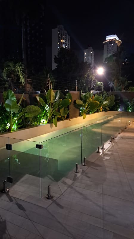 Luxury outdoor swimming pool with night lighting and landscaping.