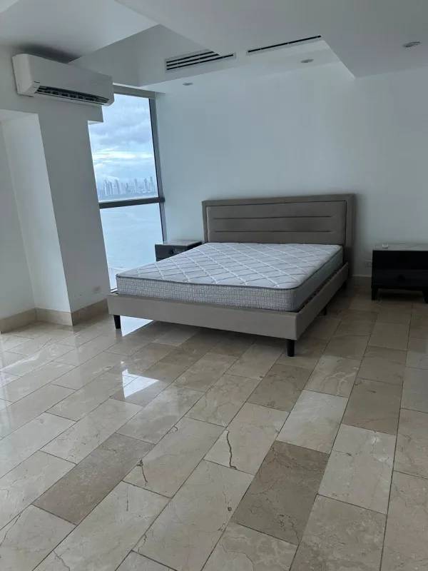 Luxury bedroom with floor-to-ceiling windows, ocean and skyline views in PH Grand Tower Panama City