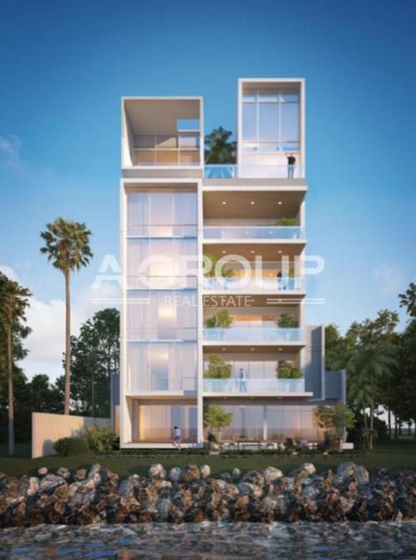 Luxury modern waterfront residential tower Almar on Island 2 Ocean Reef Islands Panama City with balconies and ocean view