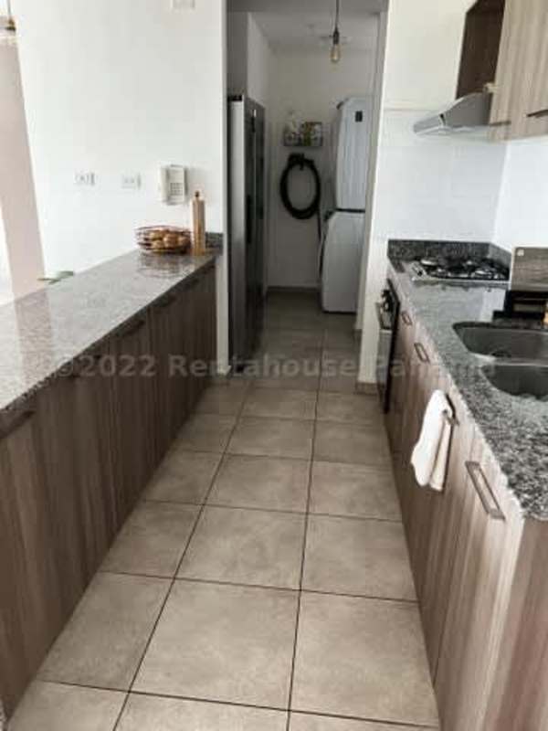 Open concept kitchen with granite counters, tile floors, and laundry area at PH Hacienda Golf II Brisas del Golf Panama