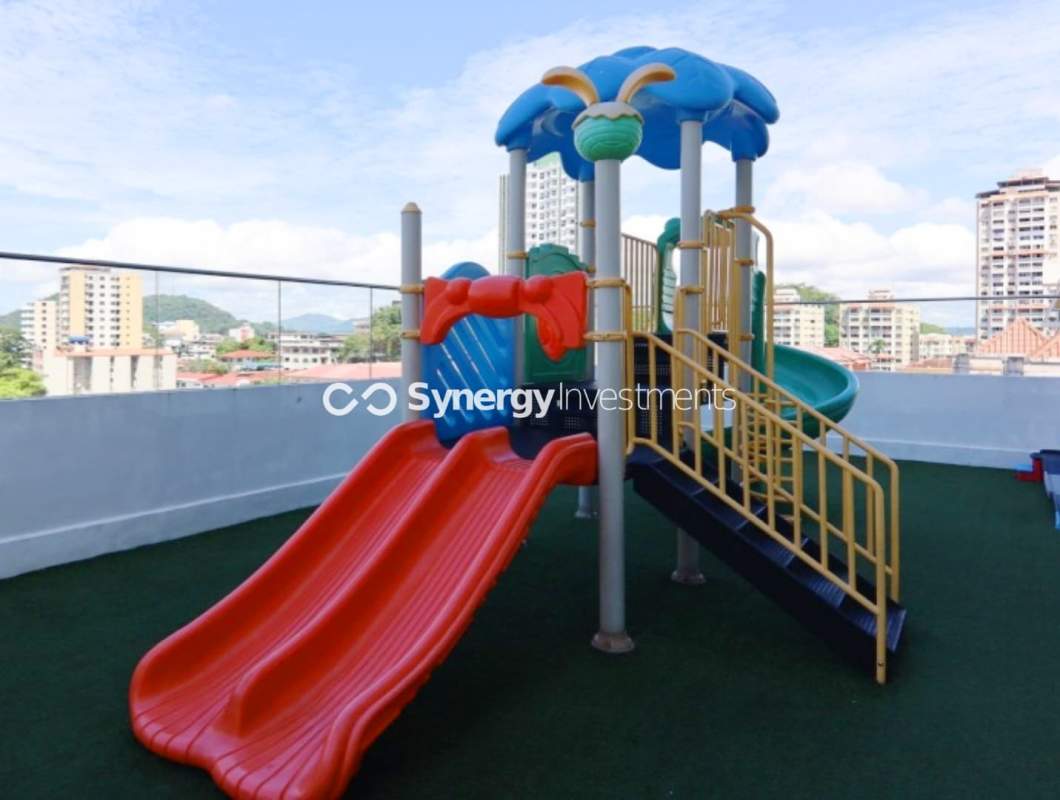Secure, rooftop play area with slides and shade.