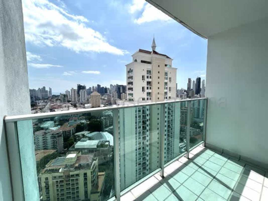 Modern balcony with glass railing overlooking Panama City skyline at PH Trinity El Carmen