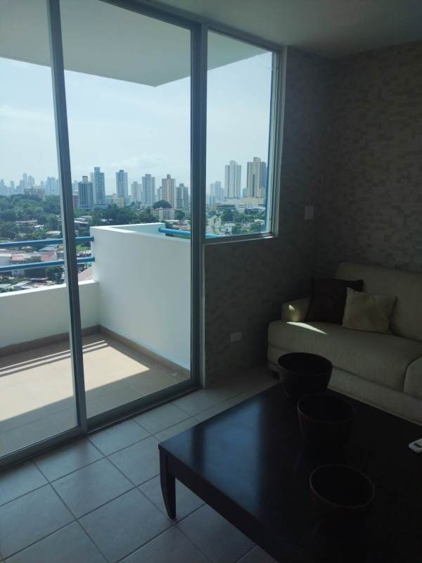 Bright living room with sliding doors to balcony offering panoramic city skyline views in PH Blue Tower Miraflores Panama