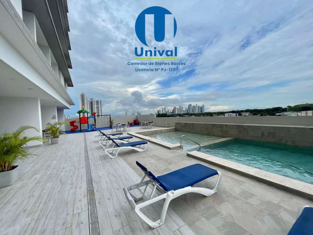 Rooftop swimming pool with sun loungers and playground in PH Alegría Vía España Parque Lefevre Panama City skyline view