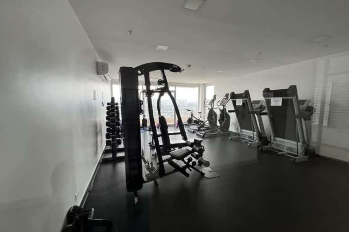 Fully equipped gym with treadmills, machines and large windows at PH Macedonia Towers in Bethania Panama City