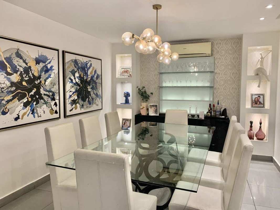Modern dining with glass table, chandelier, wall art, bar shelves in luxury condo in Panama