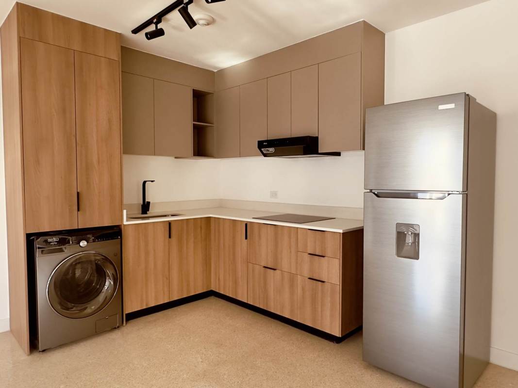Bright minimalist kitchen with refrigerator, induction cooktop, washer and wood cabinets in PH El Cangrejo Panama