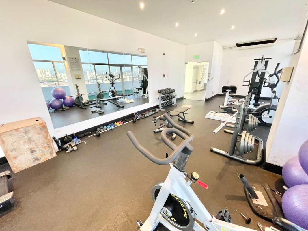 Fully-equipped fitness center with panoramic city views.