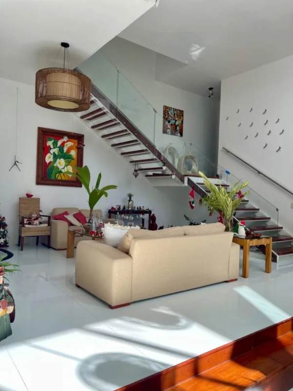 Spacious modern living room featuring double height ceilings, staircase, natural light in exclusive Altos del Golf Panama City