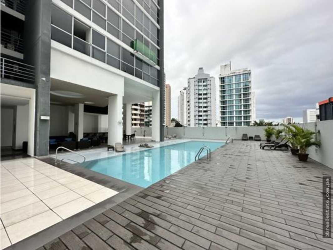 Modern apartment building PH Vitro Loft with swimming pool, sundeck and city skyline view in El Cangrejo Panama City