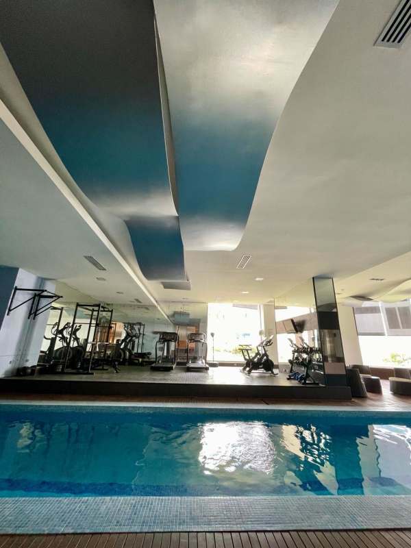 Glass-roof indoor swimming pool and lap pool with lounge areas.
