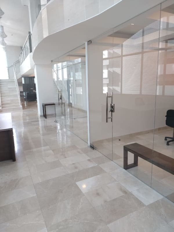 Double-height furnished office space with glass partitions and marble floors for rent in Grand Plaza Punta Pacífica