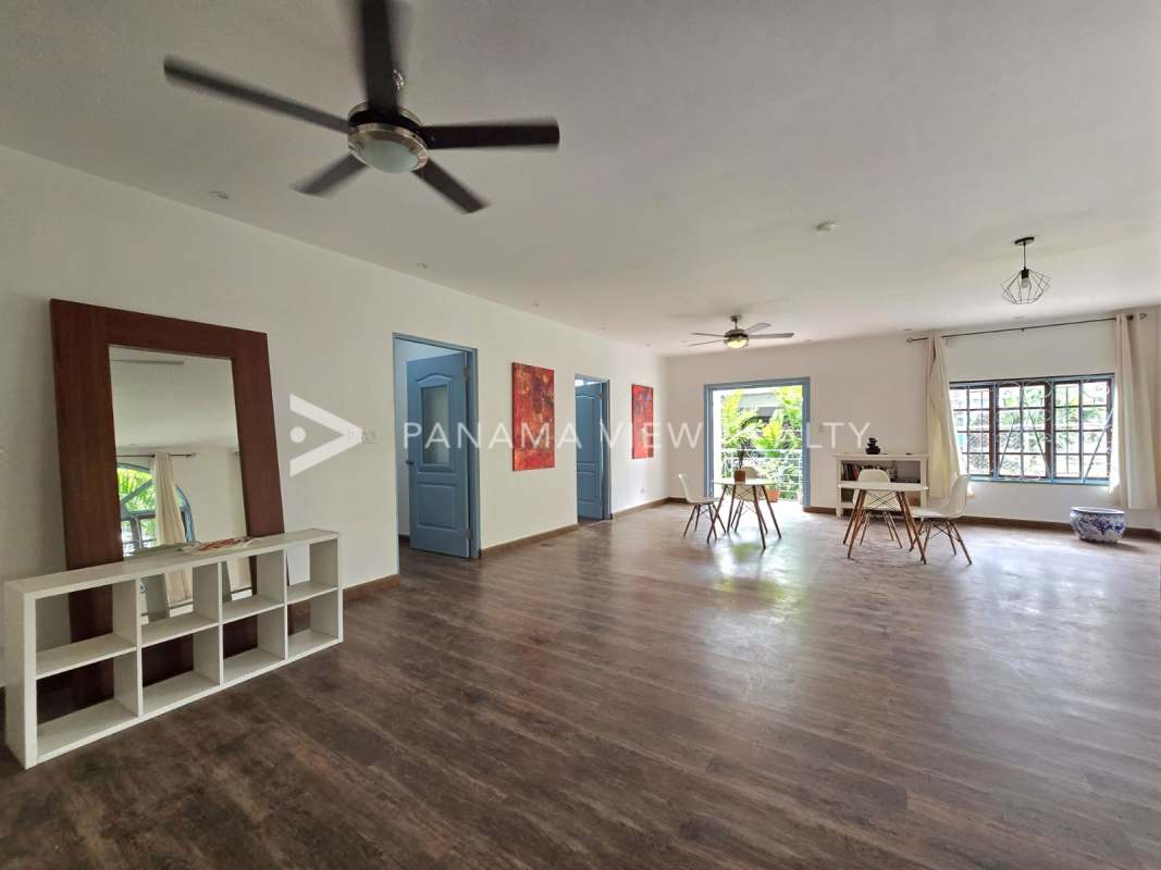 Spacious remodeled living room with marble flooring ceiling fans large windows in Obarrio Panama