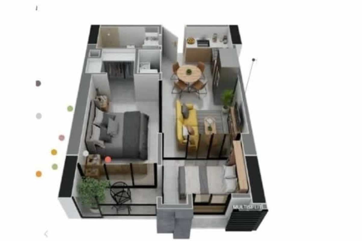 3D layout of one-bedroom apartment with balcony and open kitchen in Balboa District Panama