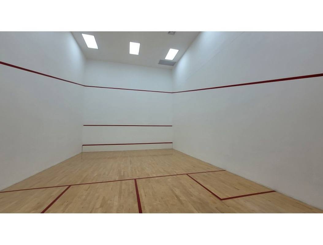 Fully equipped gym with cardio and weight stations, floor-to-ceiling windows.