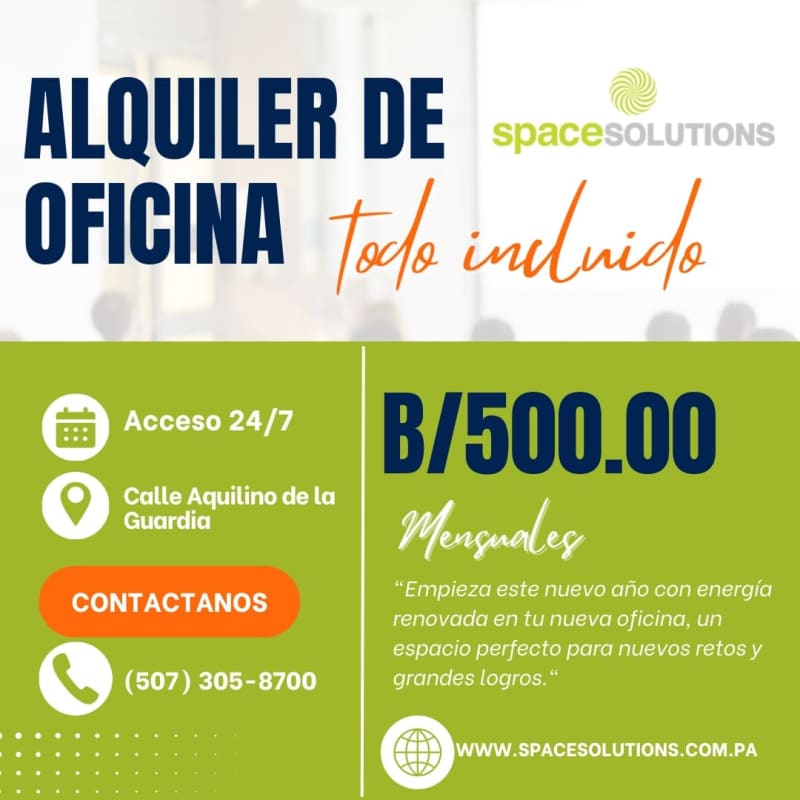 Marketing flyer for physical and virtual office rental with 24/7 access Panama City