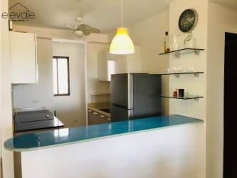 Kitchen: Fully equipped open kitchen with modern finishes in Playa Caracol condo.