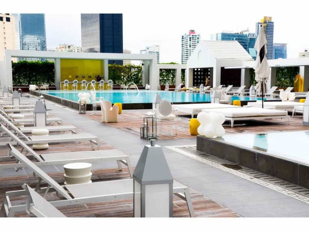 Expansive ocean view pool deck with cabanas and lounge beds