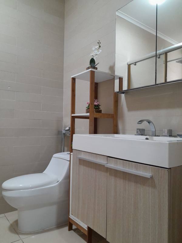 Elegant oceanfront apartment bathroom at PH BICSA Tower with vanity, mirror cabinet, beige tile, and storage shelves