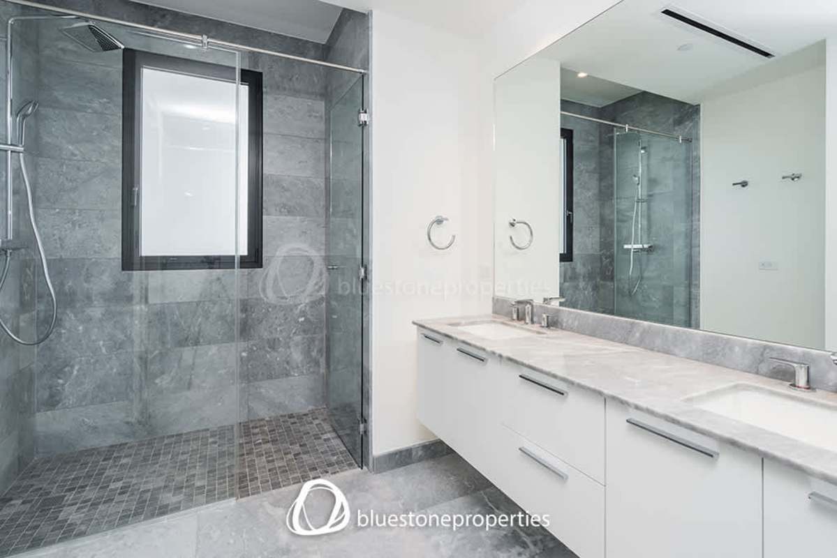 Elegant bathroom with marble counters glass shower and double sinks in PH Acqua Costa del Este Panama