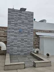Rooftop penthouse outdoor shower stone tile modern fixtures ocean view Panama