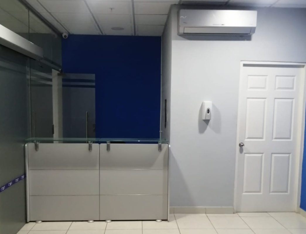 Reception with glass counter, AC, blue accent wall at OfiDepósitos Central Calidonia Panama commercial office rental