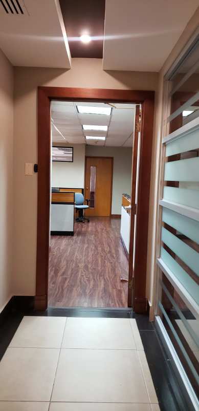 Commercial office hallway featuring frosted glass partition and wood flooring at Scotia Plaza, Bella Vista, Panama City