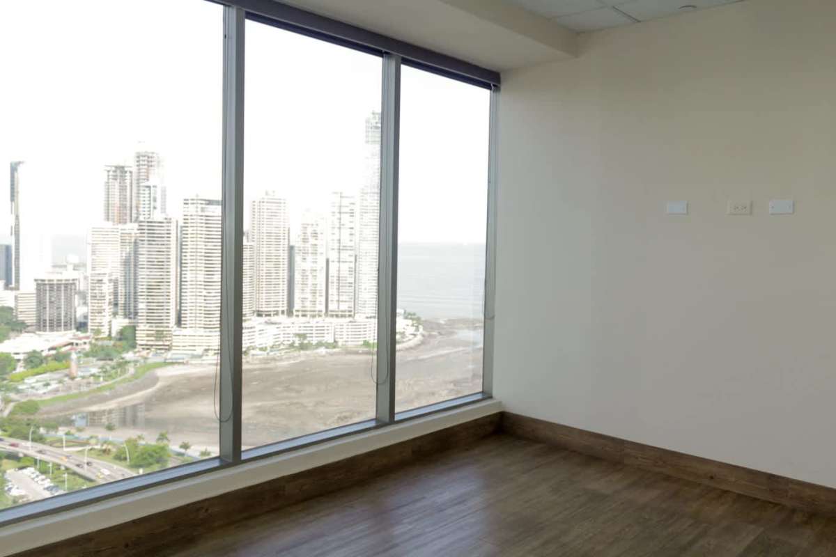Open commercial office space with floor-to-ceiling windows overlooking Pacific Ocean in PH BICSA Tower Panama City