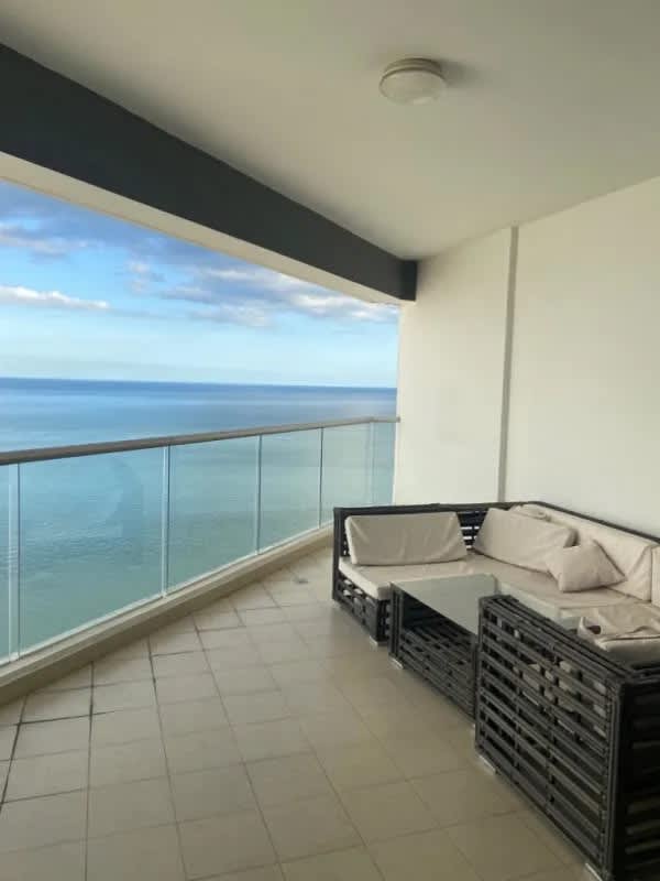 Modern oceanfront balcony with glass railing, outdoor seating, panoramic views Punta Paitilla Panama