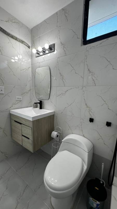 Contemporary bathroom with marble tiles and floating vanity in remodeled apartment at PH Villa del Mar Bella Vista Panama City