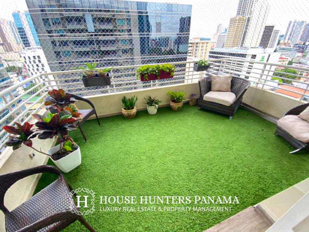 Balcony with artificial grass, potted plants, furniture, city skyline PH Sunrise Tower