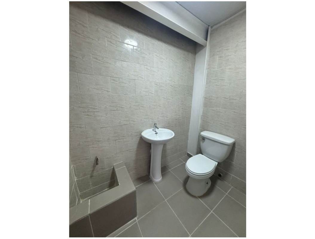 Remodeled bathroom with pedestal sink, toilet and tiled walls inside commercial unit Centro Comercial Las Mañanitas Panama City