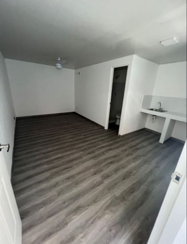 Studio/Room: Bright minimalist private room for rent in Villa de las Fuentes featuring tile floors, ceiling fan, kitchenette and private bath.