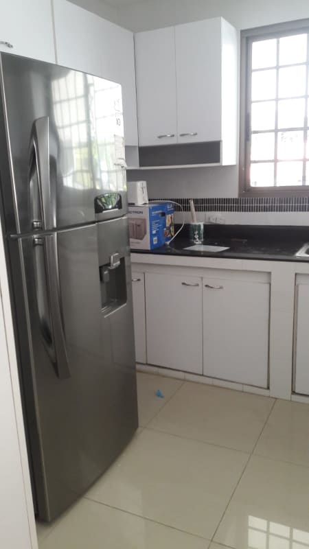 Modern kitchen with refrigerator, microwave, white cabinets, black countertop in Villa de las Fuentes Betania Panama City