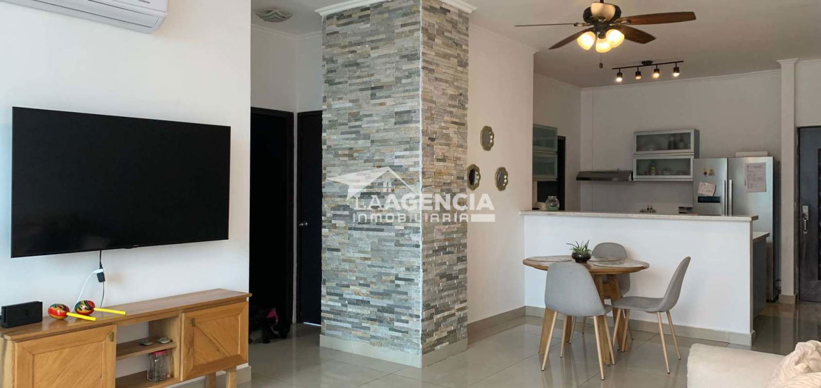 Modern open-concept living room with kitchen, stone accent wall and balcony ocean view at PH Famagosta San Francisco Panama